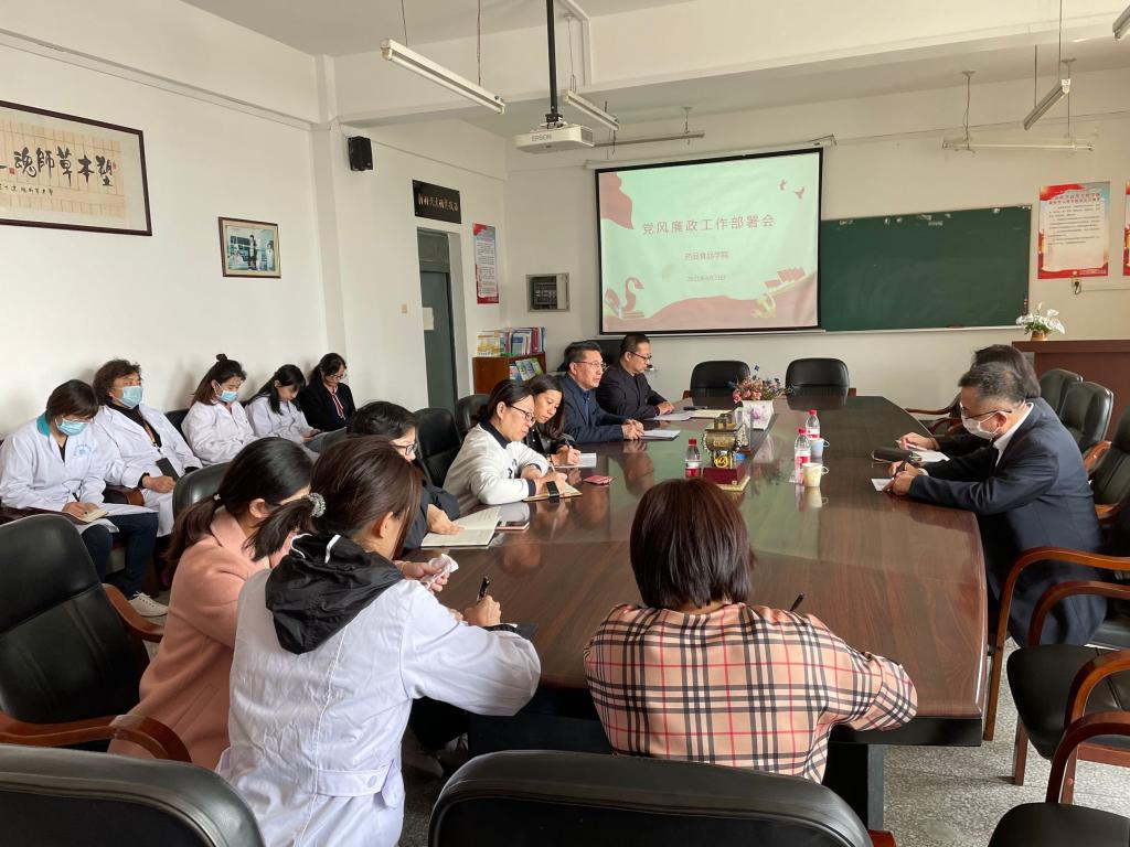 4月21日中午,药品食品学院在药学楼会议室召开了党风廉政工作部署会,学校纪委书记赵春城、纪检监察室主任董佩玲及药品食品学院全体无课教师参加了会议,会议由院长于景龙主持。
