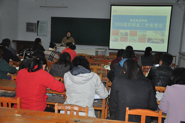 10月17日下午,药品食品学院在3654教室召开2018年意识形态工作推进会。会议由药学党总支副书记高雅静主持,院长孙莹及学院全体教师参加会议。