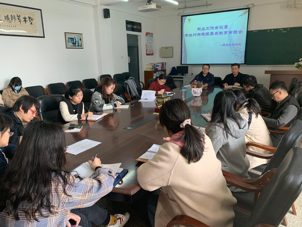 3月30日中午,药品食品学院就业工作会议暨学生行为规范养成教育专题会在药学楼六楼会议室召开。药品食品学院院长于景龙及全体专兼职辅导员出席会议,会议由党总支副书记解蕙铭主持。