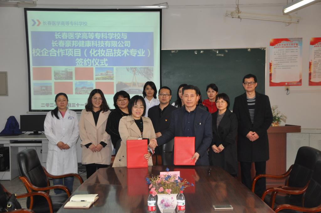 冯丽丽代表企业致辞,感谢学校对公司的信任,并介绍了长春豪邦健康科技有限公司的概况,详细说明了公司同时具备药品、食品及化妆品技术的开发和生产能力,具有雄厚的教育资源,可以对学院选派的骨干教师进行专业培训,希望通过合作实现优势互补,与学校携手共进,共同培养一批高素质、高技能的化妆品技术专业人才。